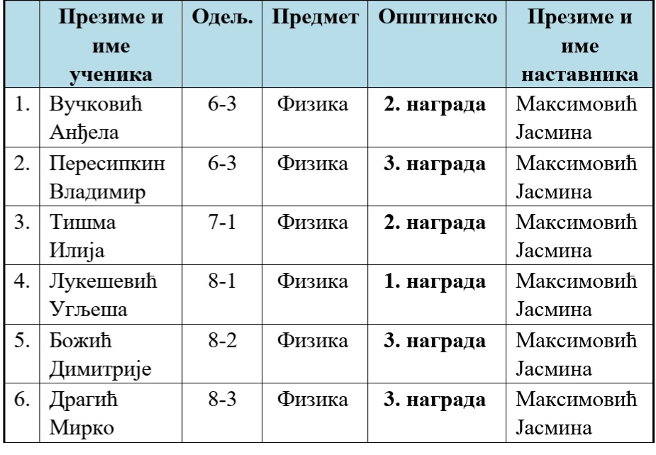 Поносни смо на наше ученике који су показали велику љубав према предмету и своје знање и постигли изванредне резултате.